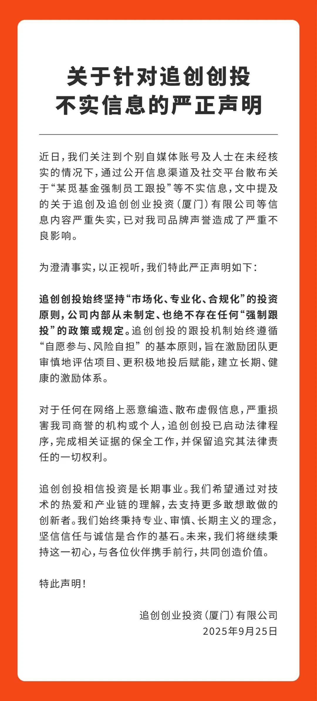 追创创投回应“强制员工跟投”传闻:消息不实(2025/09/25)
