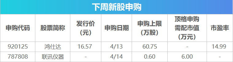 Wind数据显示,下周将有2只新股发行 ,具体来看,4月13日发行的是北交所鸿仕达;4月14日发行的是科创板联讯仪器。此外,下周还有1只新股上市 ,创达新材将于4月13日在北交所上市 。